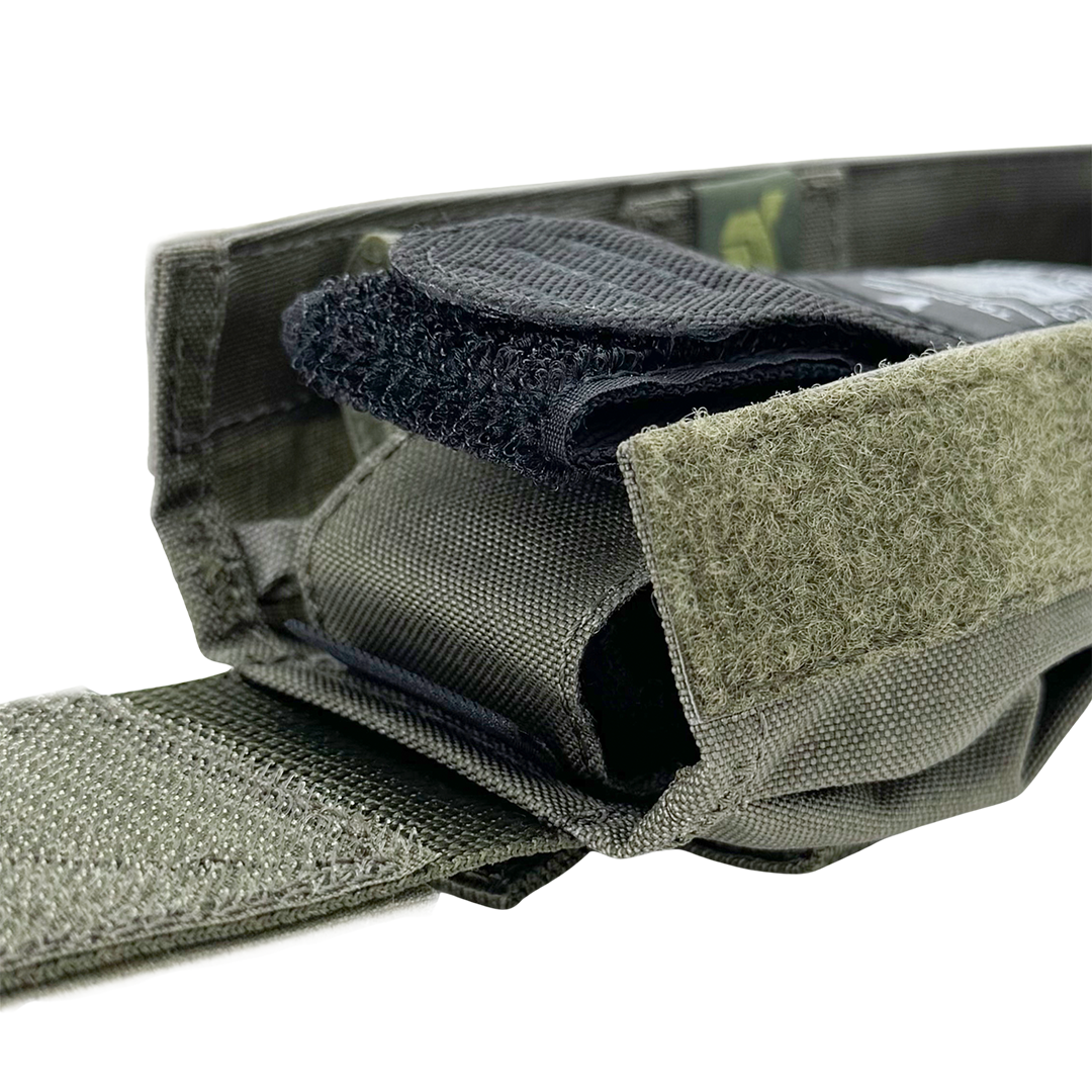 The quick-release side flap system, combined with a fully opening top flap, ensures instant access to the tourniquet. The tourniquet can be positioned in any direction using a C-shaped retainer, depending on user preference.