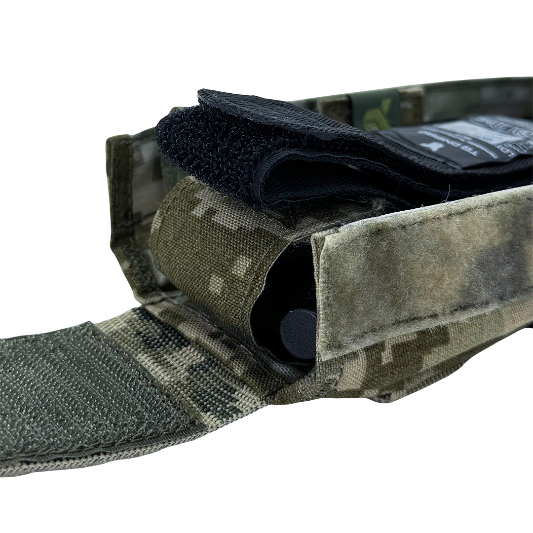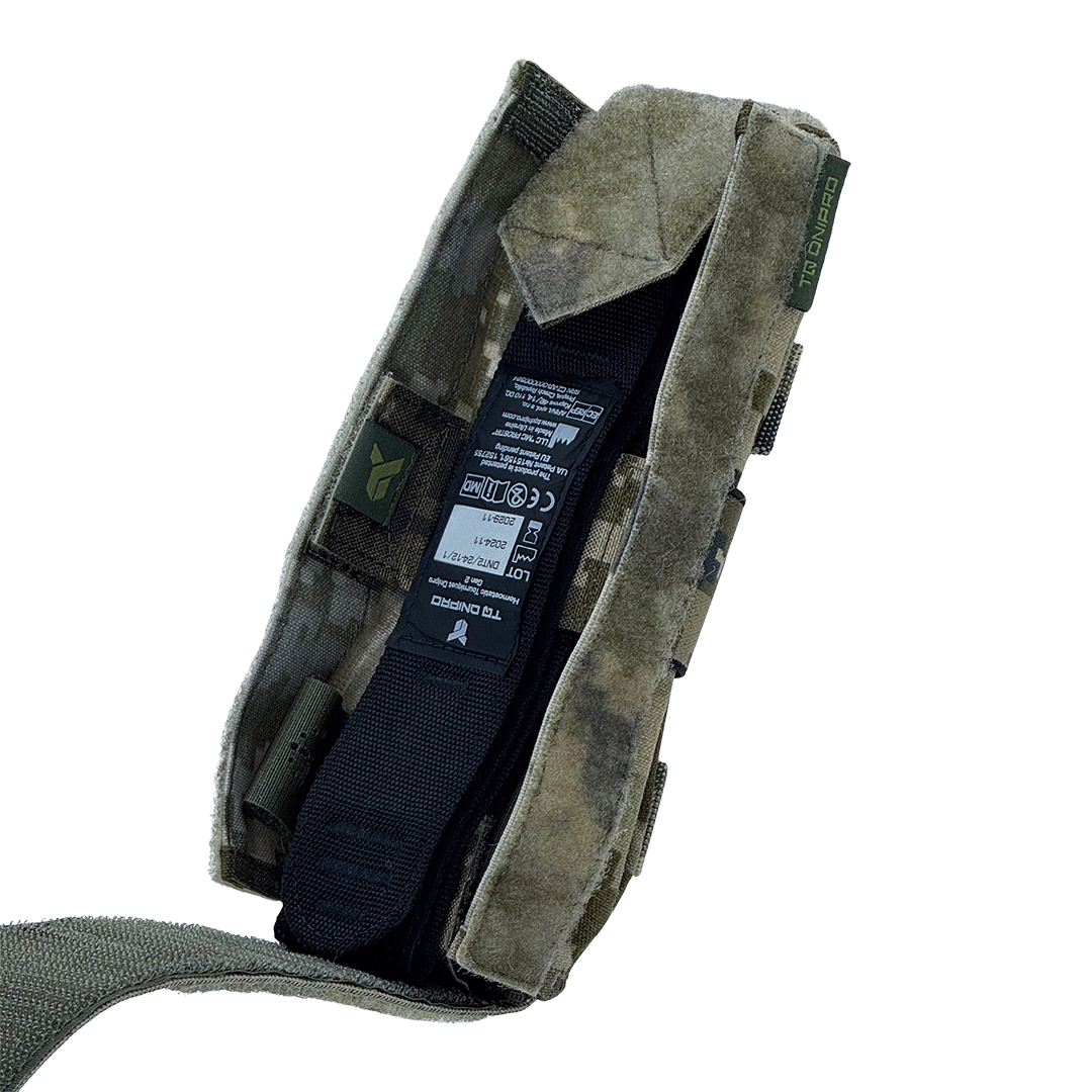 The “Dnipro” Hemostatic Tourniquet Pouch is designed for the transportation and storage of windlass tourniquets. Its fully enclosed construction provides reliable protection against environmental exposure, ultraviolet radiation, moisture, dirt, small debris, and mechanical damage during movement in combat conditions.