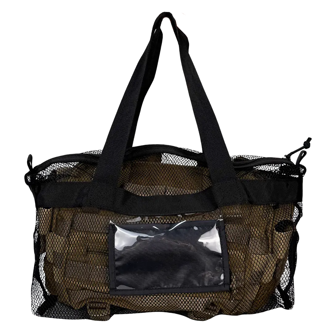 - The external side panels are equipped with mesh pockets, flap-covered compartments for four hemostatic tourniquets and two side carrying handles.
