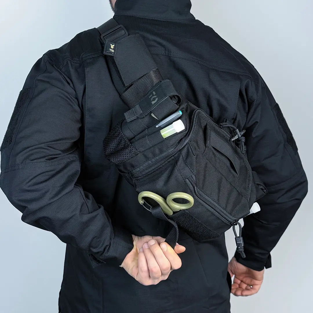 - Зовнішні бокові стінки оснащені сітчастими кишенями, відділеннями для 2-х кровоспинних турнікетів та еластичними тримачами для хімічних джерел світла та маркерів.