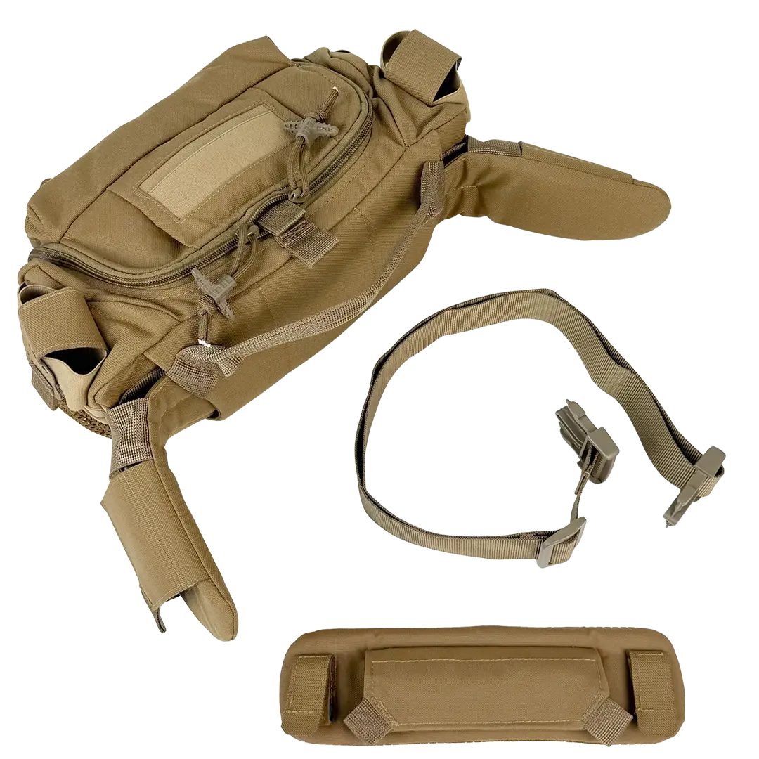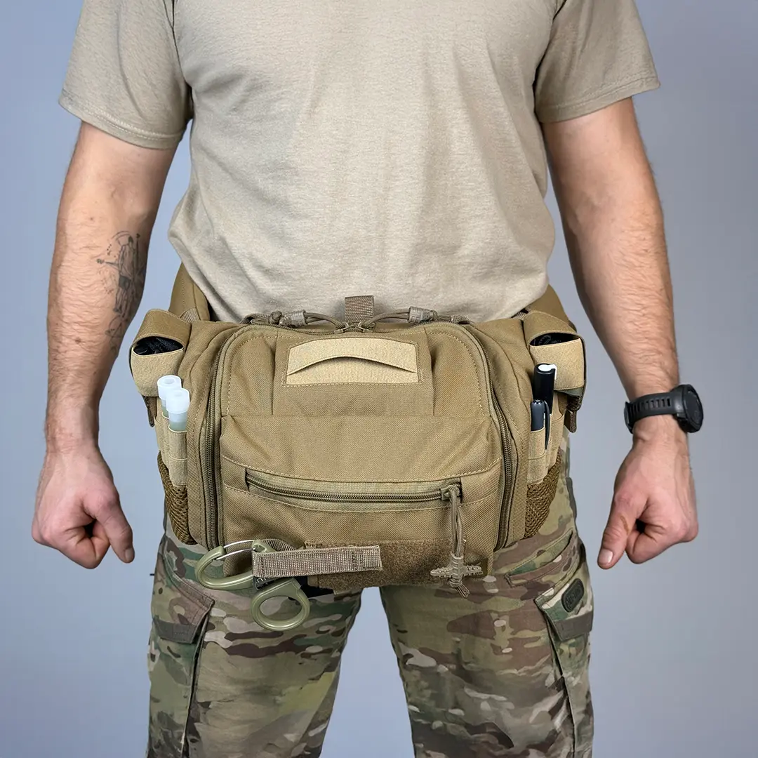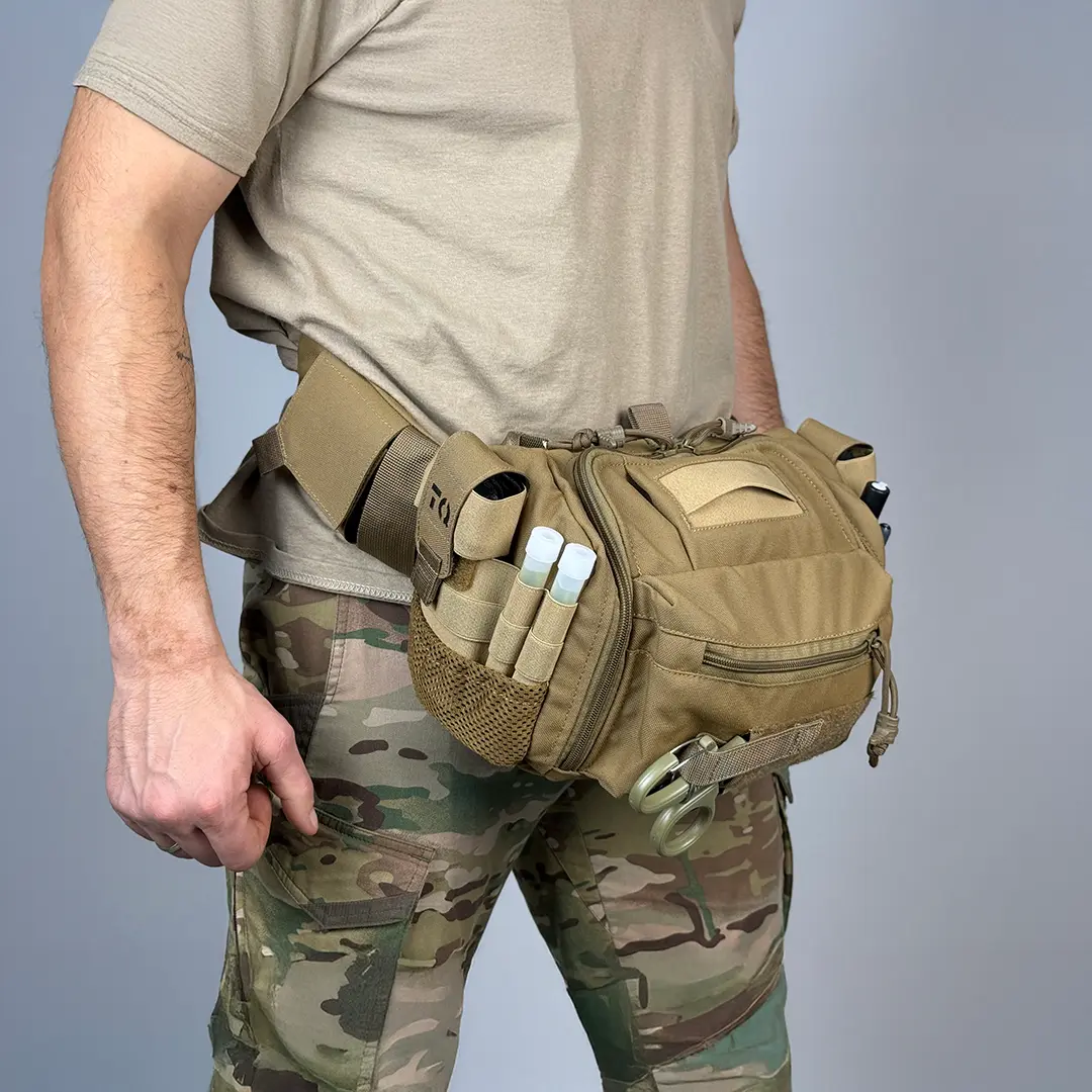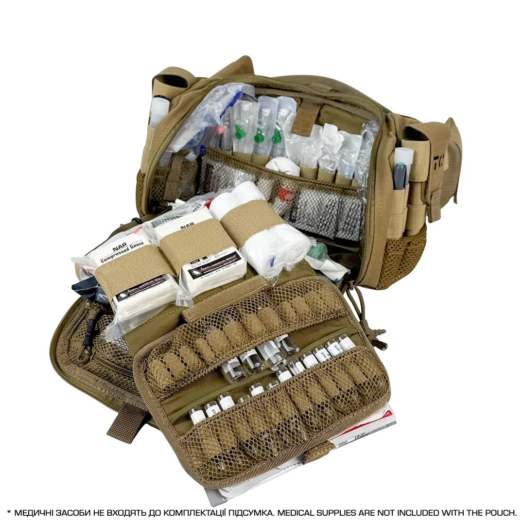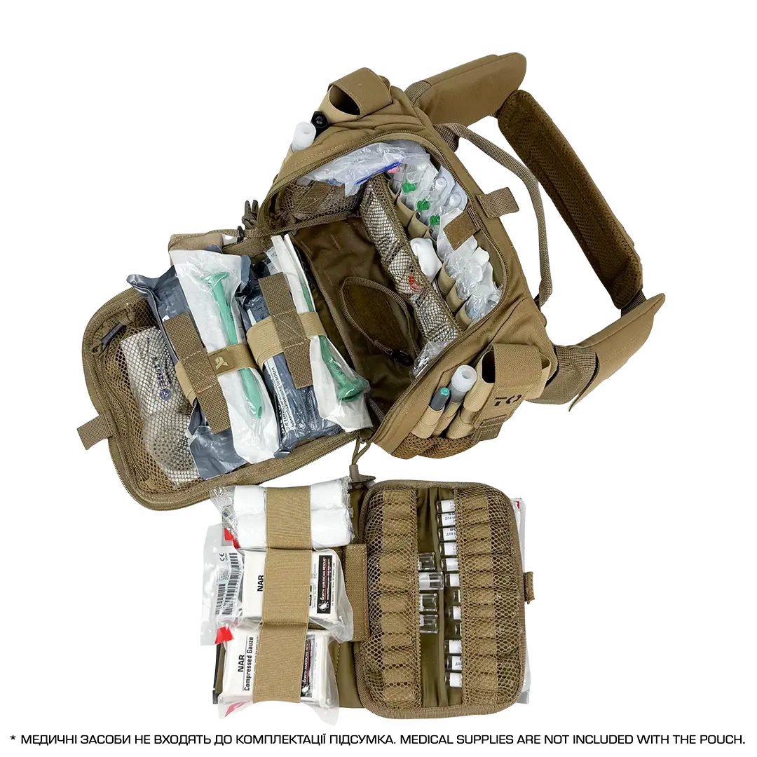 Сумка медика гібридна, модель РМ33 Coyote — компактний та захищений органайзер, призначений для розміщення комбінованого набору надання першої догоспітальної допомоги декільком постраждалим згідно алгоритму MARCH та засобів проведення екстреної інфузійної терапії. Розроблено для військових, цивільних медиків та рятувальників.