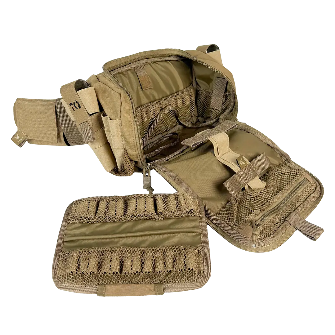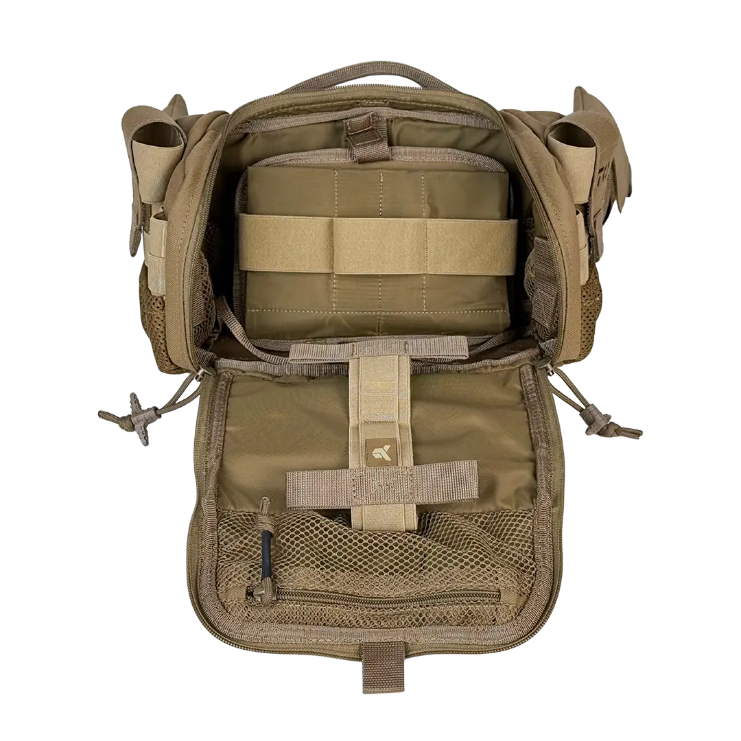 - Передня частина сумки у вигляді повністю відкривного клапану, має простору кишеню на застібці, відділення для тактичних ножиць з можливістю їх фіксації, еластичну кишеню для ретрактора, відділ для оглядових рукавичок з можливістю швидкого доступу та велкро-панель для ідентифікаційних патчів.
