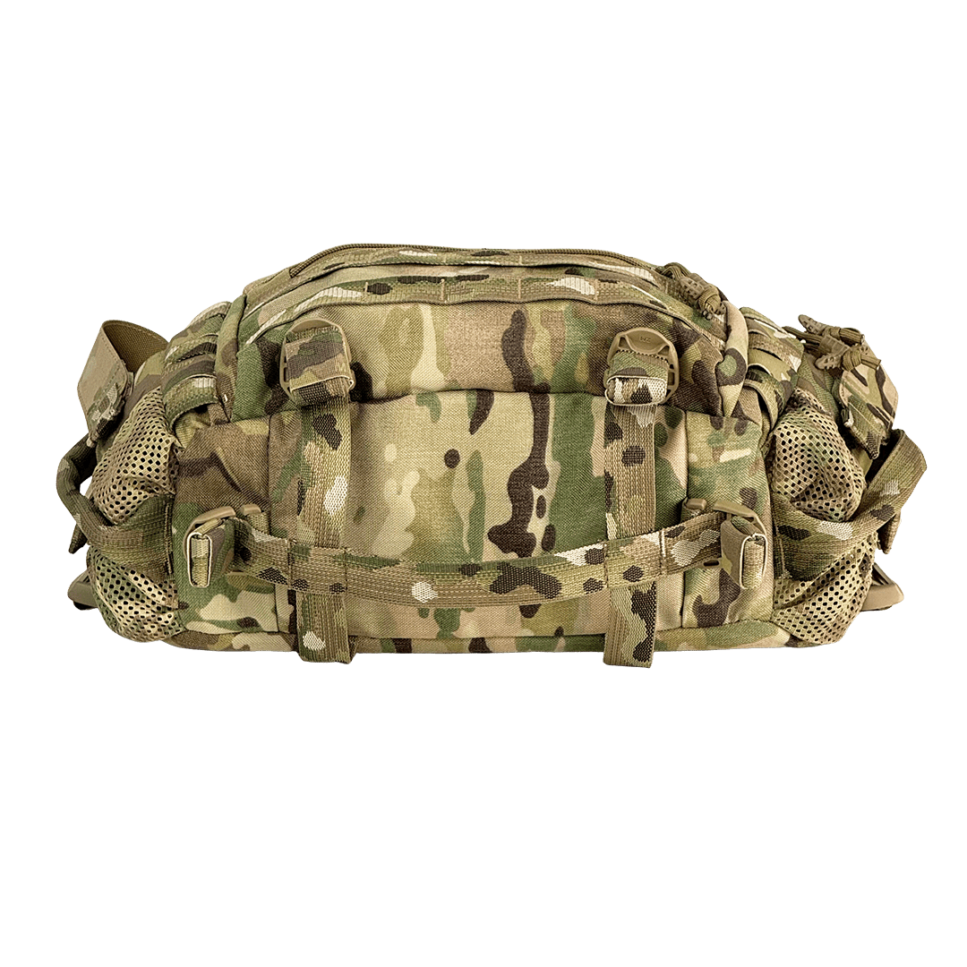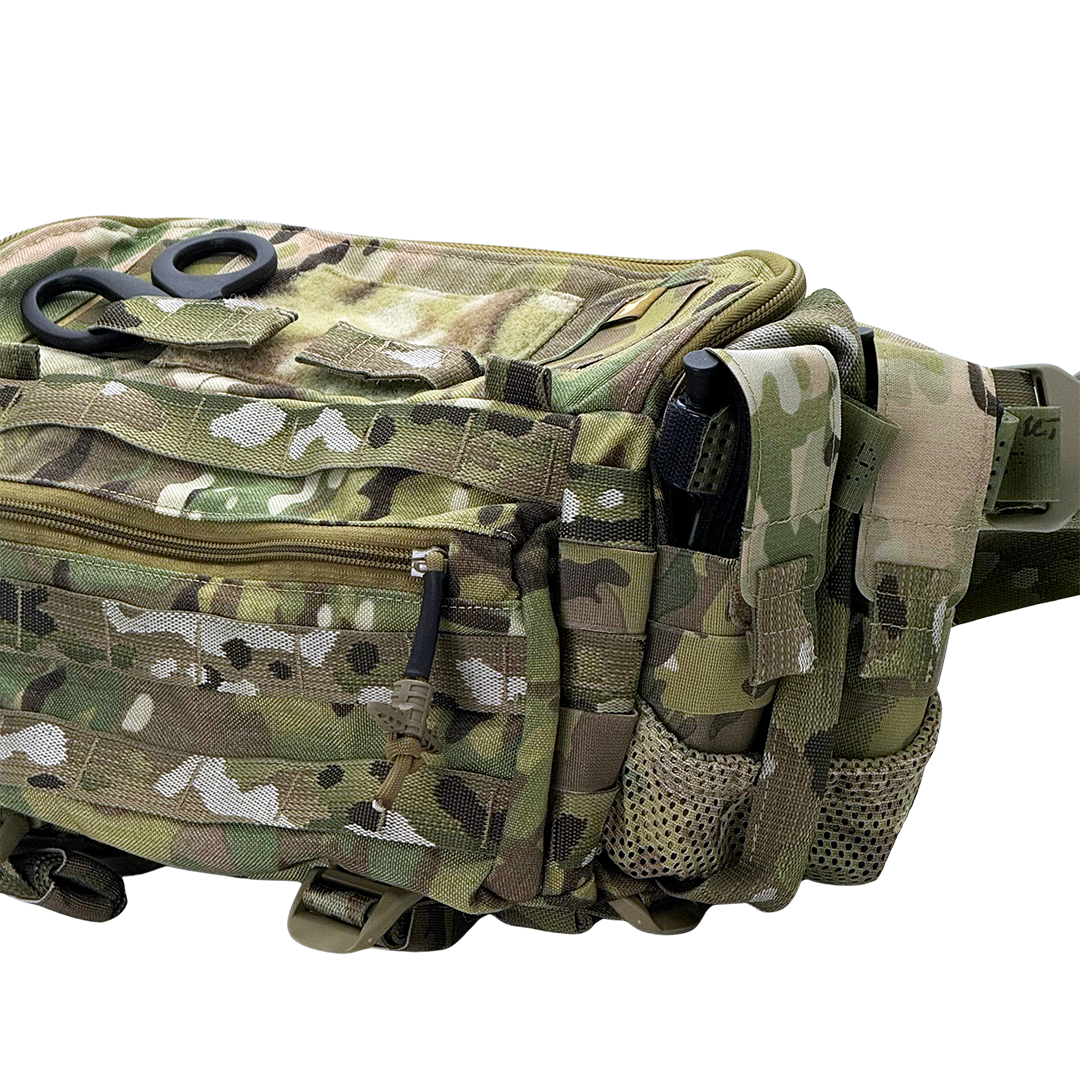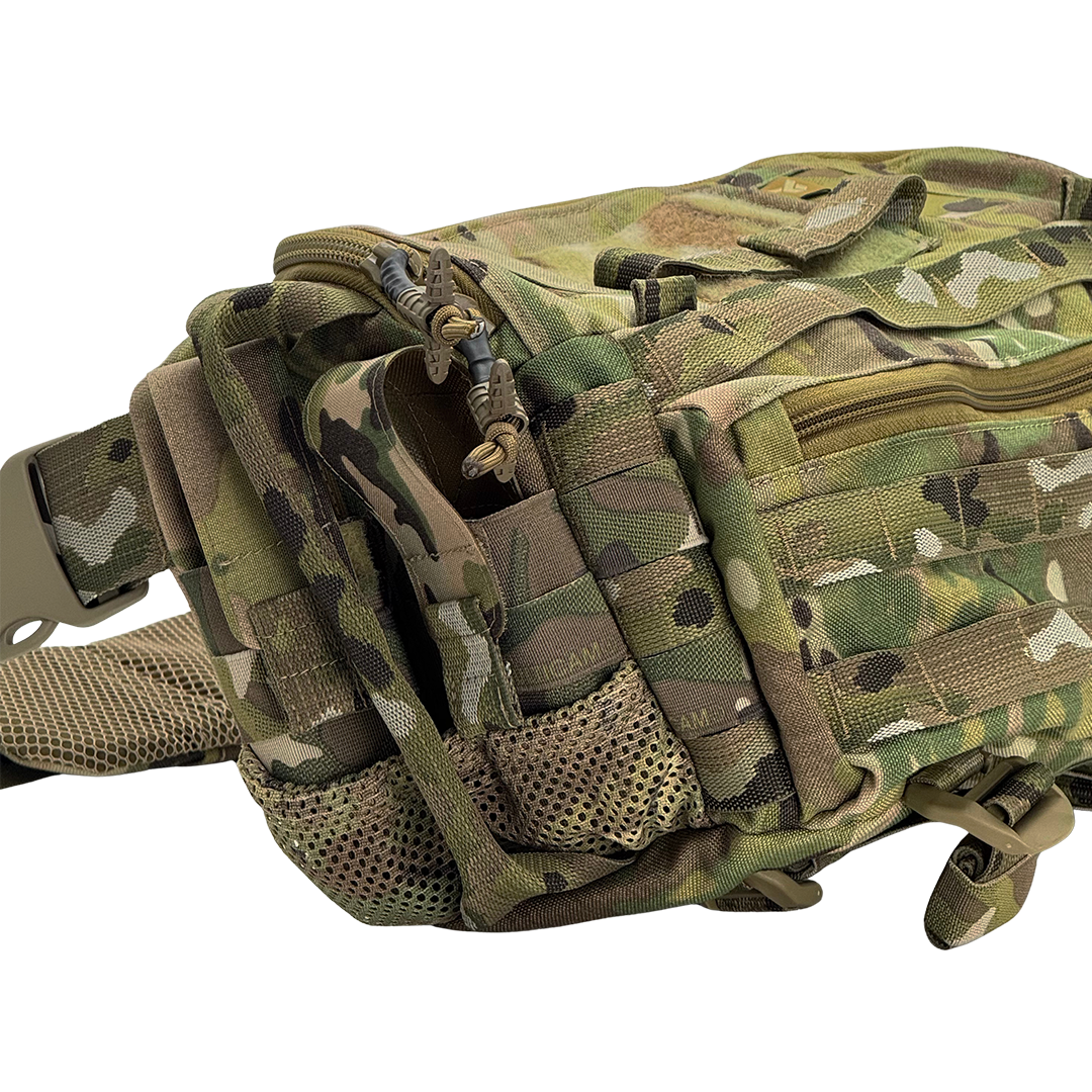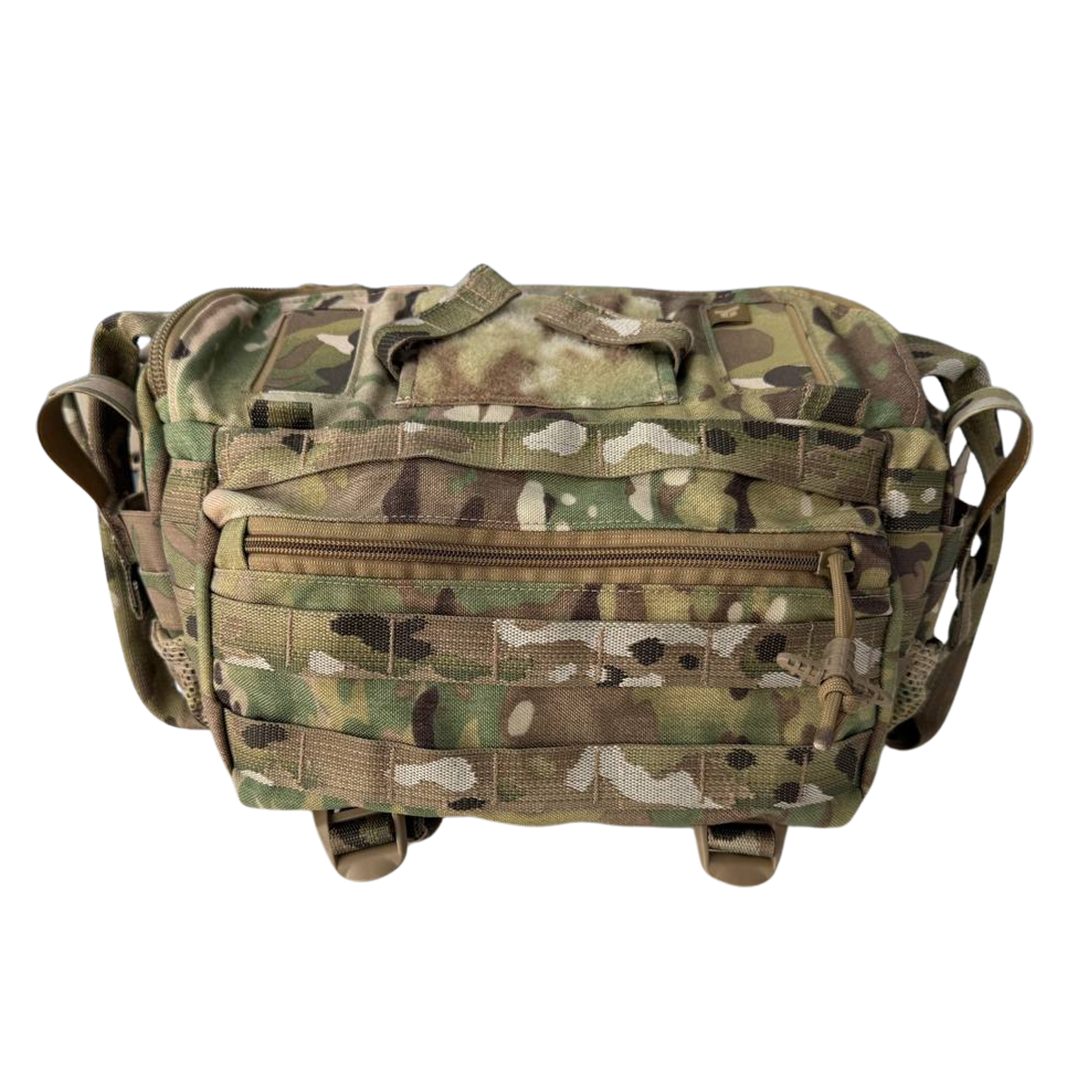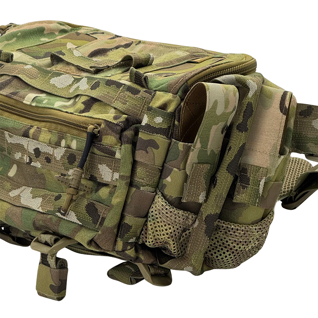 - Зовнішні бокові панелі оснащені сітчастими кишенями, відділеннями з клапанами для турнікетів та двома боковими ручками для переносу.